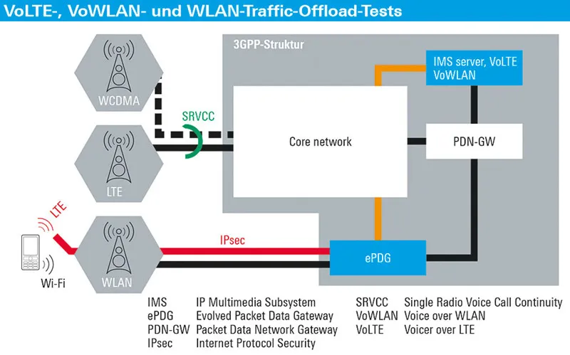 Integrated Server File transfer via File Transfer Protocol (FTP) Web browsing via Hypertext Transport Protocol (HTTP) IP Multimedia Subsystem (IMS) server supporting voice calls (e.g. VoLTE) and SMS over IMS DNS server supporting DNS requests Video Streaming Server (RTP) ePDG (Evolved Packet Data Gatway) for Wifi offloading testing eMBMS (Evolved Multimedia Broadcast Multicast Service) mini service layer Measurements functionality Ping measurement, testing the network latency IPerf measurement, testing the throughput and reliability, using TCP/IP and UDP/IP Throughput measurement, indicating the total throughput at the DAU (Data-Application-Unit) on IP level DNS request measurement, monitoring all DNS queries addressed to the internal DNS server IP logging application, creating log files of the IP traffic at the LAN DAU connector or between DAU and mobile Influencing the IP stream with IP Impairments (delay, jitter, packet losses a.o.) Integrated IP traffic and protocol analysis to determine the transported protocol and/or applications