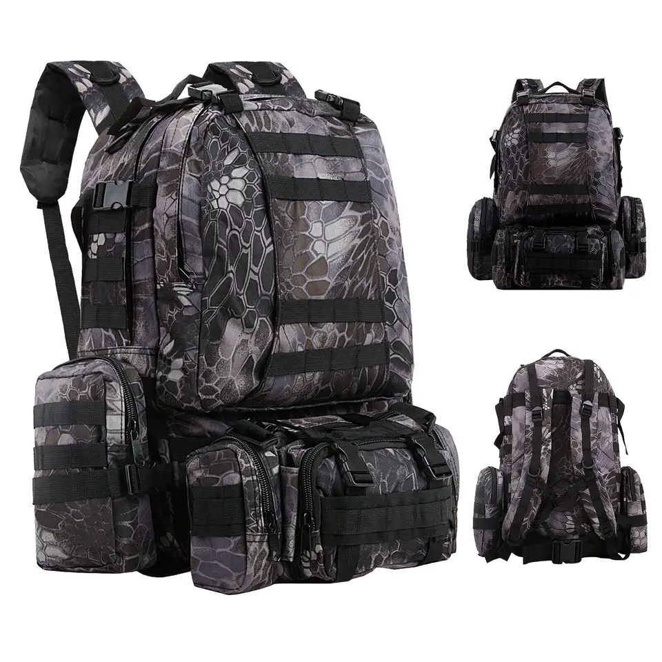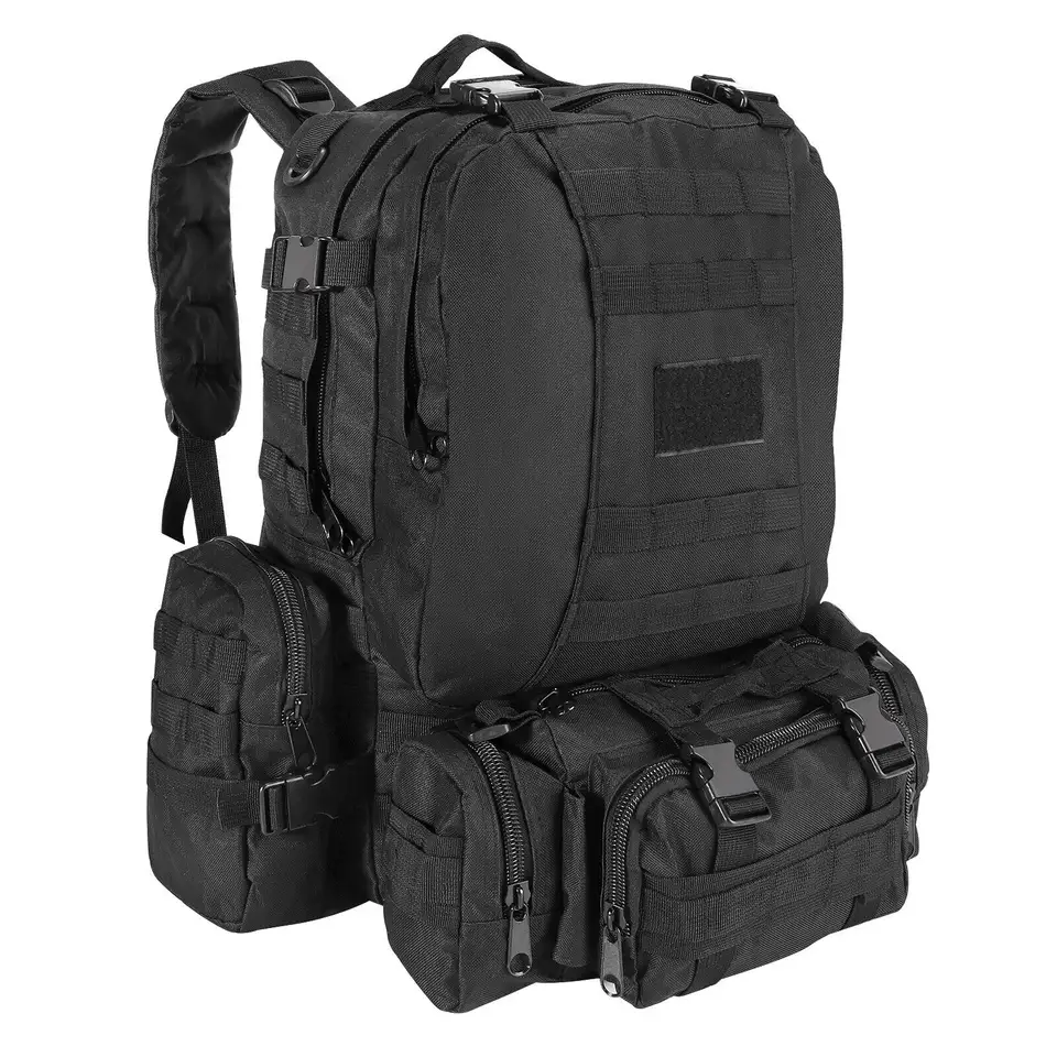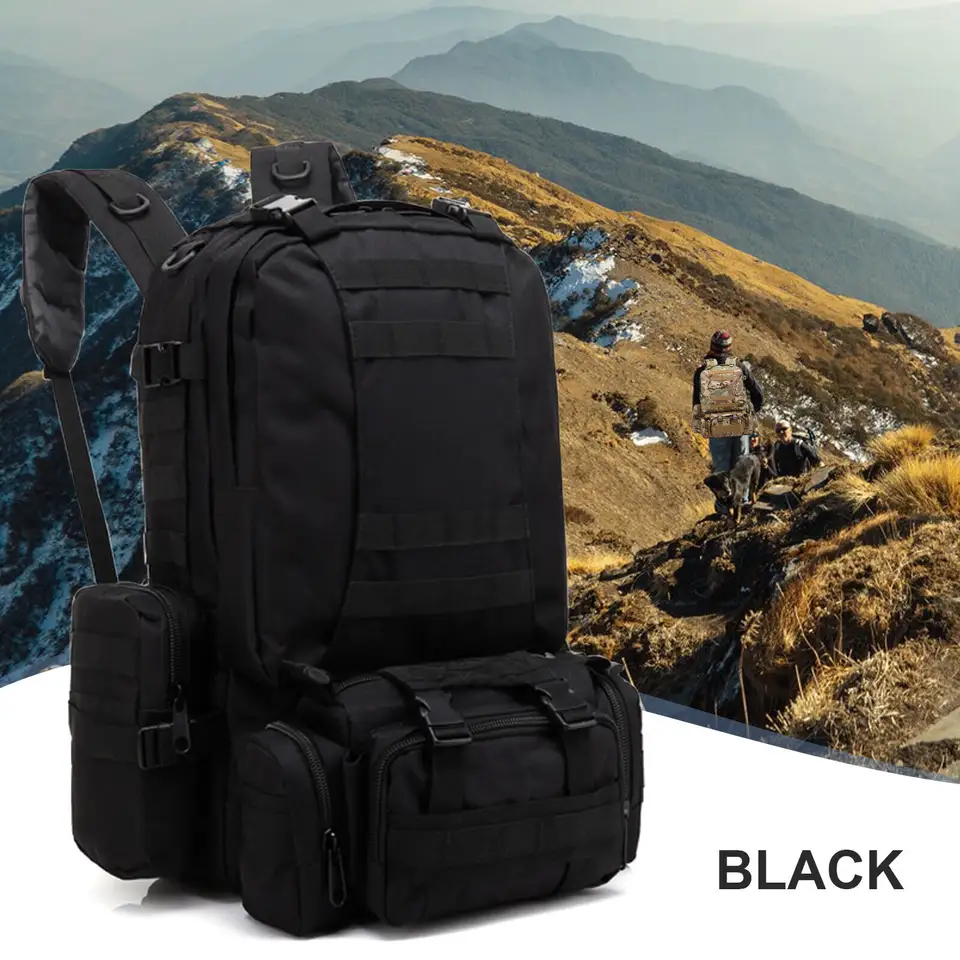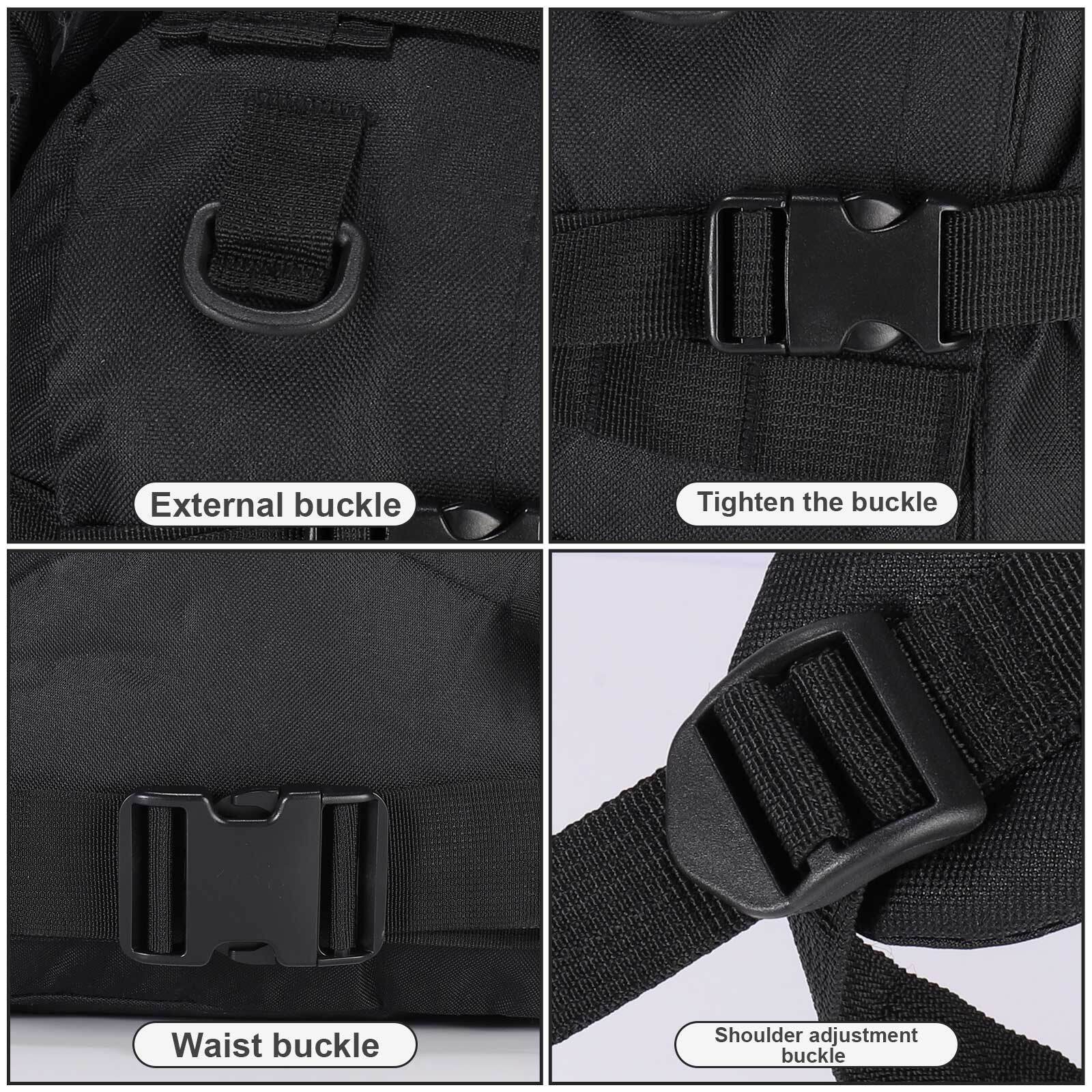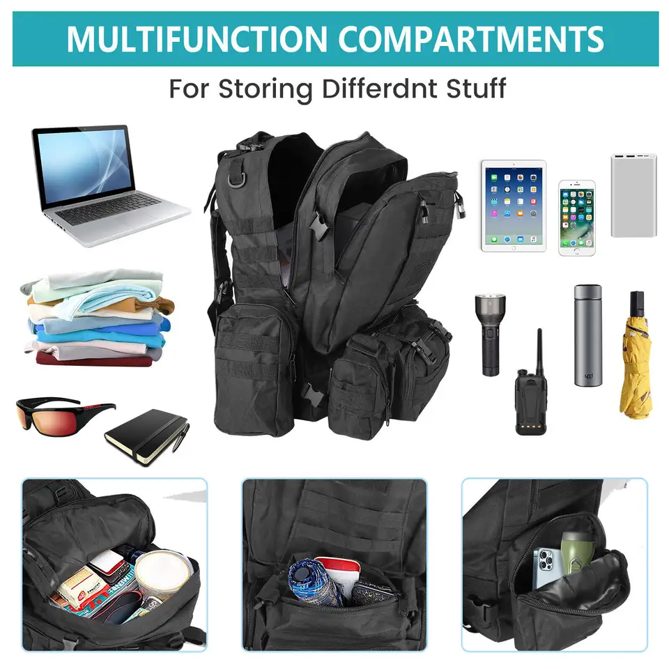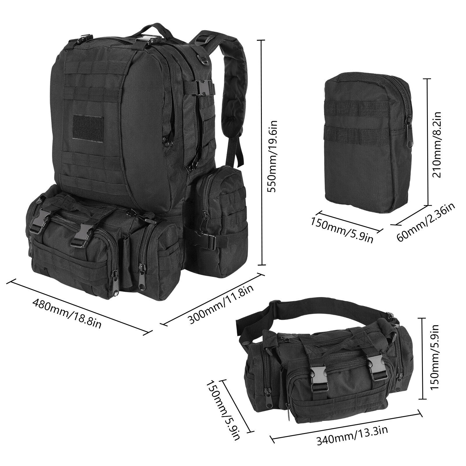 【Durable Waterproof Material】Tactical backpack is made of high-density 900D Oxford cloth. Soft and breathable, scratch-resistant, wrinkle-resistant, high abrasion resistance. 【COMBINATION AND DETACHABLE BACKPACK】Molle Tactical Backpack adopts 4-in-1 design, which can be combined or used separately. The pack is divided into a main pack, a front detachable tactical fanny pack and two side detachable accessory pockets.